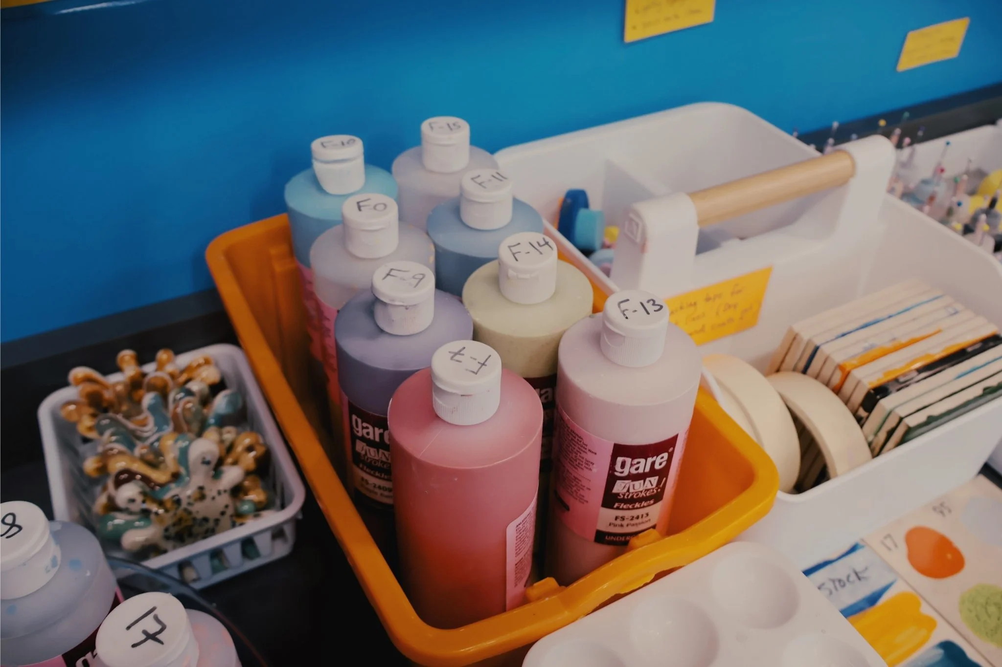 We are a walk in service, where you pick from our selection of hundreds of choices to paint, you can take as long as you like to finish an item, and once you are done we clear glaze your pottery and fire it in our on-site kiln and give you a pick up date. (Usually within 1 week).